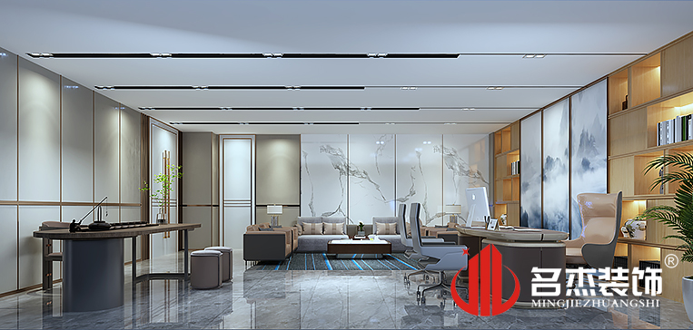 整體空間使用簡約時尚的風格,加入圓形和長條形的燈具加入,讓辦公室裝修空間增添了不少的時尚感。部分區域使用了大理石條紋作為背景墻的要素,使得整個總經理室增加了不少的大氣穩重感。