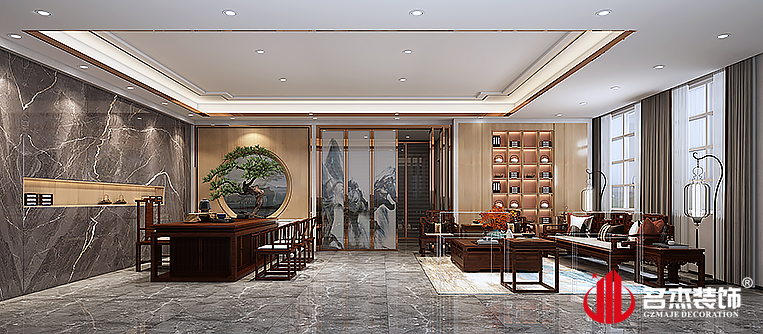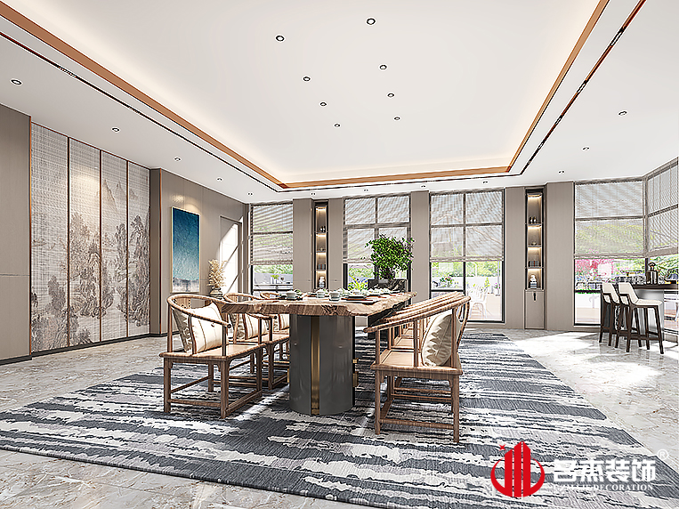 設(shè)計(jì)師在天花增加了層次起到了很好的區(qū)域劃分作用,從中式元素入手,通過有節(jié)制的極簡設(shè)計(jì)來賦予空間中式典雅的魅力。辦公區(qū)域多處使用景觀的元素,也使得空間和傳統(tǒng)時(shí)尚簡約風(fēng)格有著不一樣的特色。