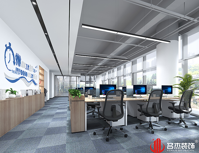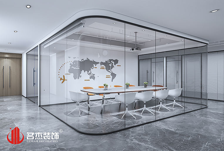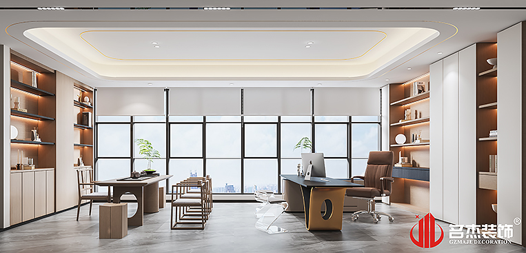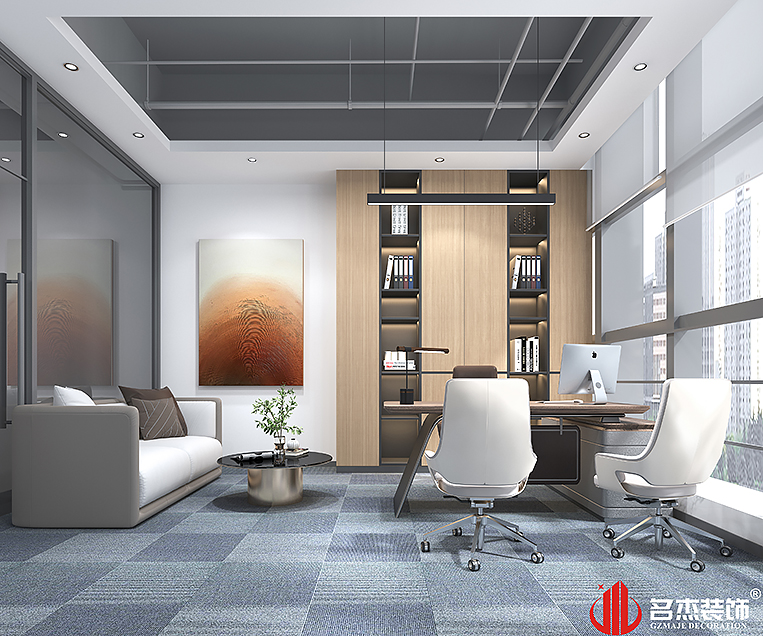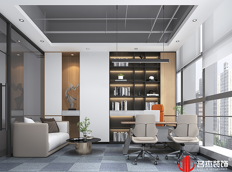 整個空間加入使用傳統(tǒng)的黑白灰作為主色調(diào),同時加入暖色橙色作為點綴,讓空間的層次感更加突出。前臺區(qū)域在天花吊頂方面使用水波紋不銹鋼作為整個空間的點睛之筆,重點突出行業(yè)特點的同時也為整個辦公裝修設計空間增加更多的氛圍感。