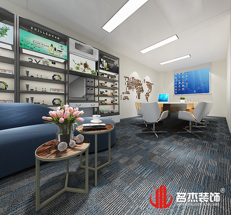 考慮到化妝品以女性為主,現代女性審美以小清新自然風居多。整體以薄荷綠和原木色相互交替,視覺感清新優雅,更能留住女性的心。辦公室區域裝修又較為不同,明顯分別出各個區域,員工的舒適就是工作動力業績上升的踏板。