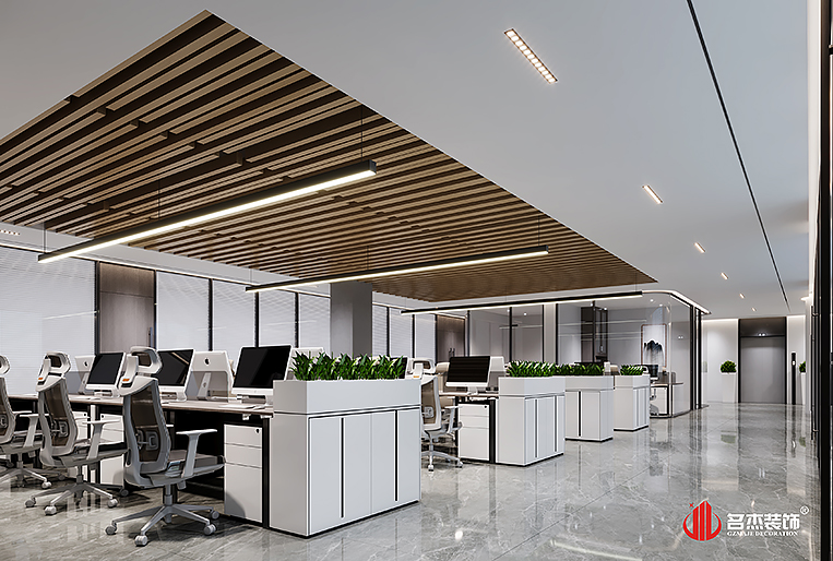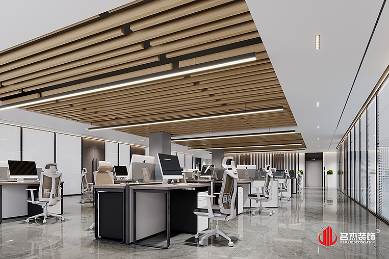 一樓大堂區(qū)域使用的是時尚風格搭配奢華的元素,讓整體空間看上去更加大氣時尚。在兩邊設置的企業(yè)文化墻以及大屏幕,可以讓來訪的客戶迅速了解到企業(yè)的發(fā)展歷程以及企業(yè)文化。而在開放辦公區(qū)域則使用鋁格柵天花作為空間的點綴元素,簡約元素搭配出不一樣的層次感。