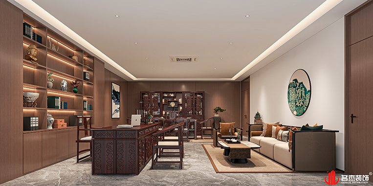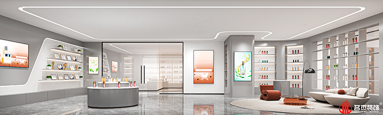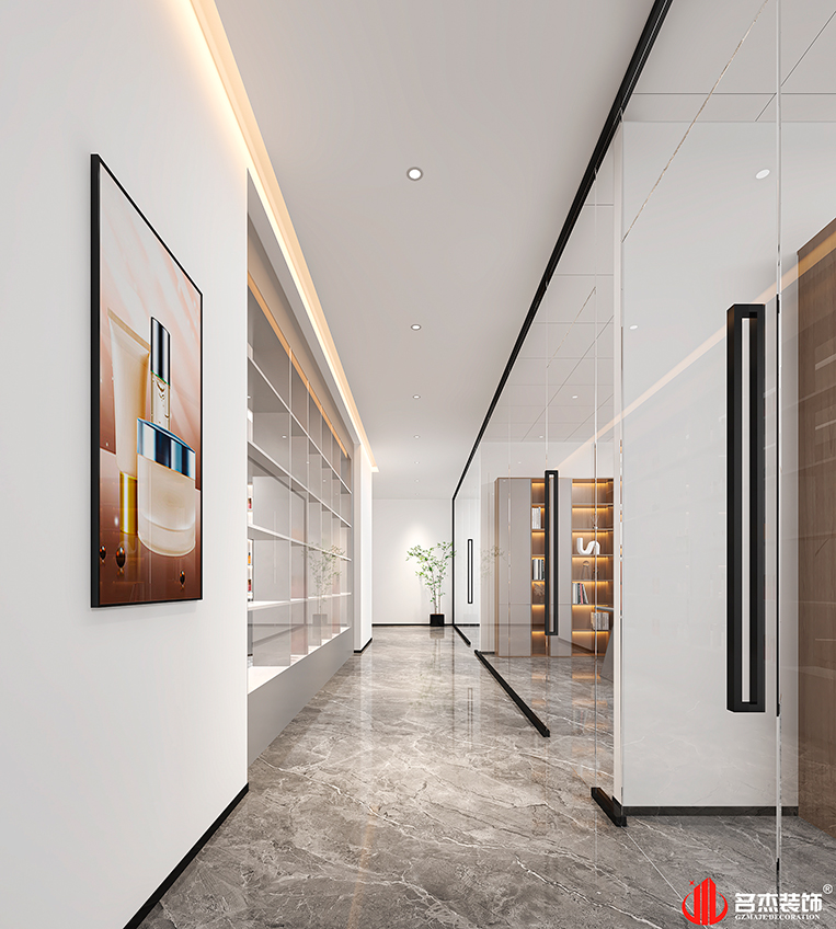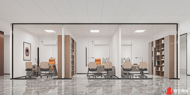 設計團隊根據現場實際情況,定制前臺區域的方式,使用企業LOGO色來作為空間的點綴。河流狀態的橙色造型,寓意著業務川流不息。而在展廳區域則是使用傳統方圓的設計手法,使用灰色的色調搭配流動的燈帶造型,凸顯出該空間的不平凡。#廣州辦公室裝修#