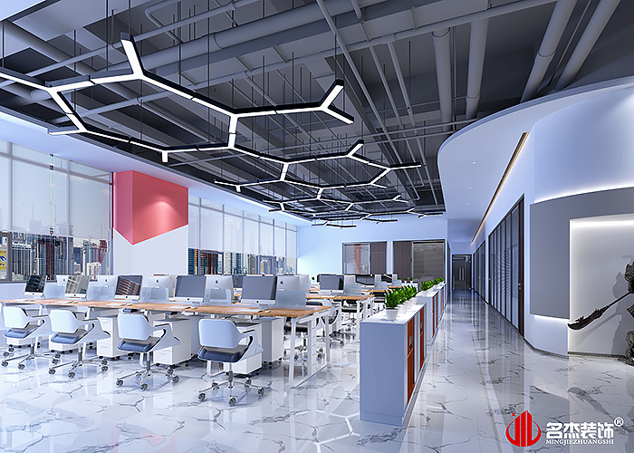 前臺區域加入了很多的弧形元素,為整體的設計感大大提升了好幾個檔次,同時也在部分的柱子上加入企業LOGO色來作為點綴。展廳天花部分則采用蜂巢狀的燈具,表達出一種像蜂群一樣的勤勞工作的寓意。