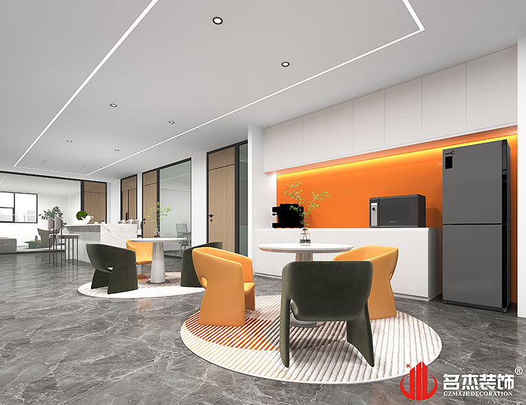 整體辦公空間裝修設(shè)計當(dāng)中使用橙色作為空間的點(diǎn)綴色,讓空間能夠抓人眼球的元素,同時還可以提高辦公室裝修設(shè)計空間的層次感。休閑區(qū)也使用了較為傳統(tǒng)的元素進(jìn)行裝修設(shè)計,加入亮眼的橙色作為點(diǎn)綴色,可以讓員工得到放松。