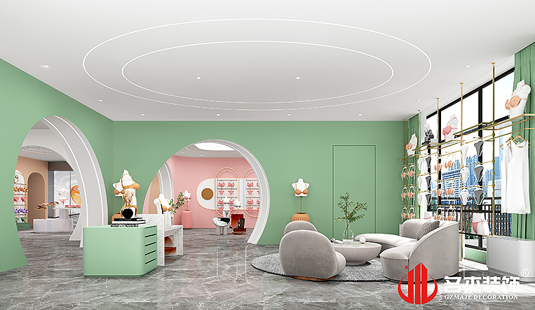 在前臺區域使用線條和弧形元素來增加空間的設計層次感,同時在整體設計當中加入了莫蘭迪色系作為點綴元素,讓空間的設計層次感再次得到提升。不同子品牌采用的是不同的顏色,這樣容易讓大眾更好的識別,同時賦予子品牌不一樣的活力,再加上不同于常規造型的門,突出想要做出別樣的裝修設計風格。