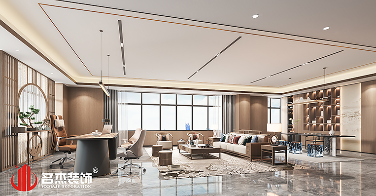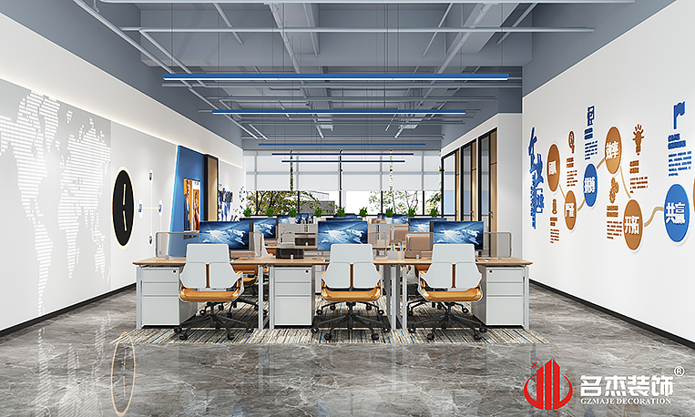 在前臺區域天花和背景墻使用鐘表元素,再加上弧形線條的加入,相互一種呼應,形成一個非常贊的企業文化對外宣傳元素。同時在展廳吊頂上面也加入鐘表元素,讓空間和展品搭配,重點突出該企業的元素,也給每個人留下一個深刻的印象。整個辦公裝修設計空間都在使用不同的線條來增加空間的層次感,以及使用設計感強烈的元素來讓空間增添更多的設計感。