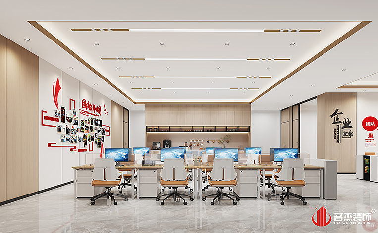 整個辦公空間采用的是時尚簡約風格來打造的,使用傳統的黑白色作為設計的主色調,同時原木色作為點綴元素,讓空間變得更加有特色。全局使用天花吊頂也能夠讓空間整體看起來更加有質感,不同的燈飾也能夠營造出不一樣的氛圍。