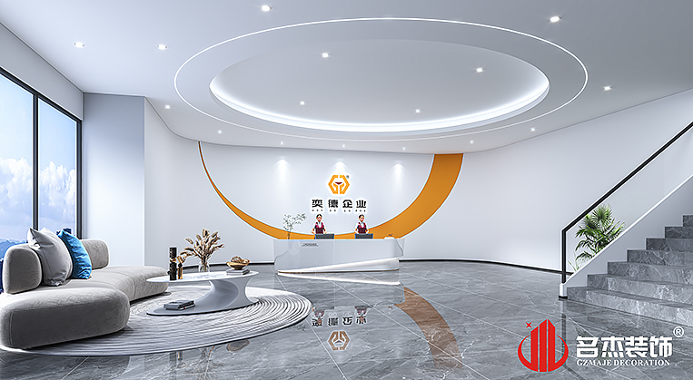 前廳區域采用企業的logo色系來作為點綴的色調,加上一點弧形元素來作為空間的點睛設計手法,同時搭配圓形吊頂,讓整體空間變得更加有趣。其他辦公裝修設計空間區域采用的是時尚簡約的風格去搭建,讓簡約的元素能夠進入到每一個角落當中,更好的展示企業的氛圍。