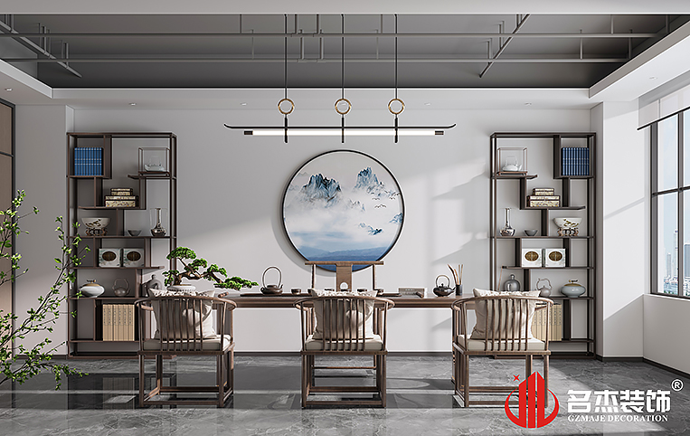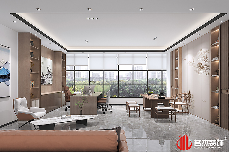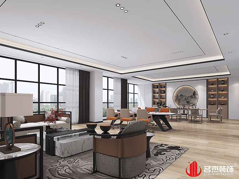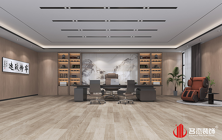 整個辦公空間裝修設計是充滿著時尚的質感,前臺區域使用質感強烈的鋁單板作為背景墻的材料,加以沖孔板配合燈光點綴,做出不一樣的效果,同時在柱子等地方使用硝基漆讓空間的質感更上一個檔次,再加上大板地磚的使用,讓整個前臺的變得更加時尚大氣有質感。經理室空間則是使用簡約的元素,加上傳統的元素,突出一個精練。