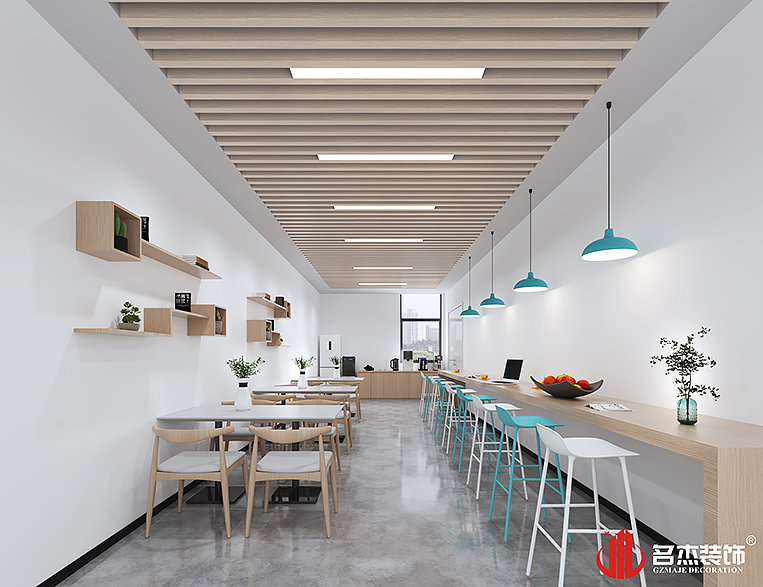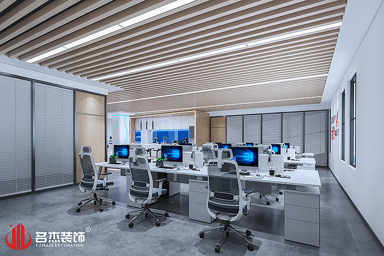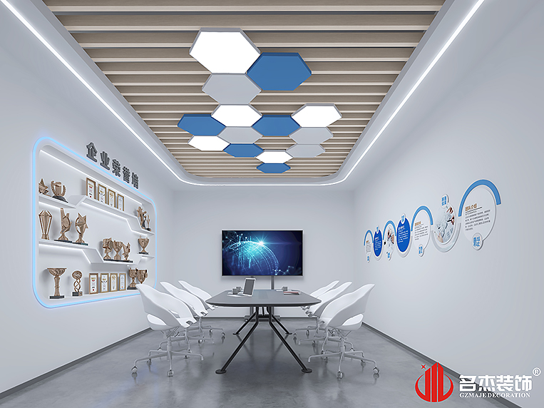 由于該行業是屬于高新科技行業,設計團隊在整個辦公室裝修設計空間加入木色的吊頂,讓空間的格調不再屬于冷色調,同時在部分區域加入科技的元素,響應出該行業的科技屬性。在展廳區域則是特意使用上多邊形的木色吊頂,沿著動線來構造,形成一種呼應。